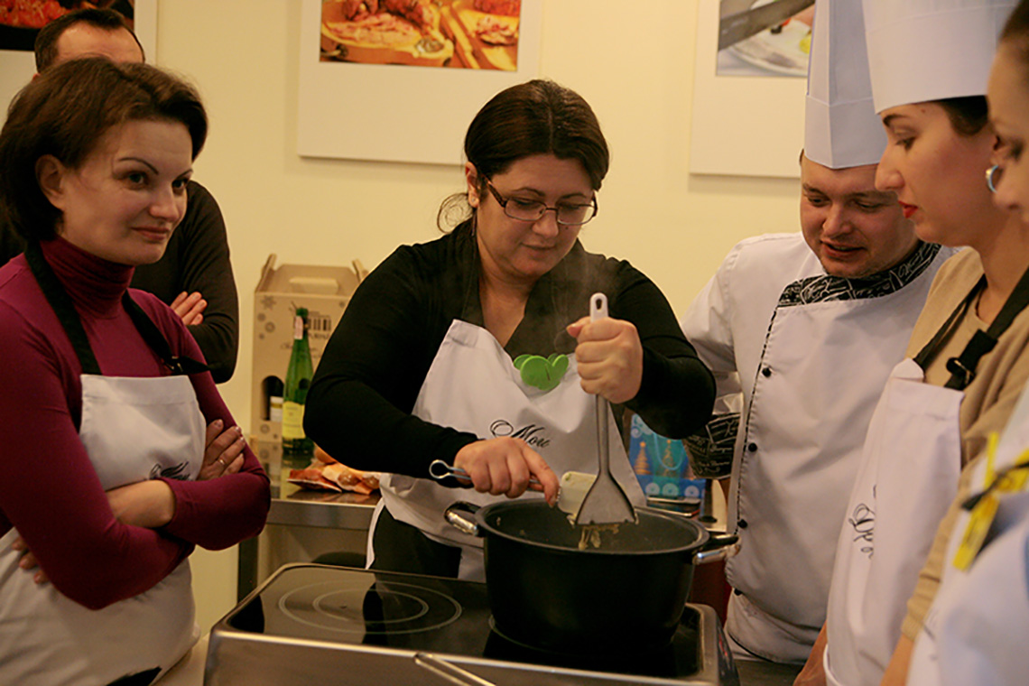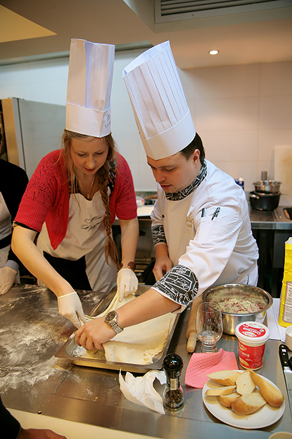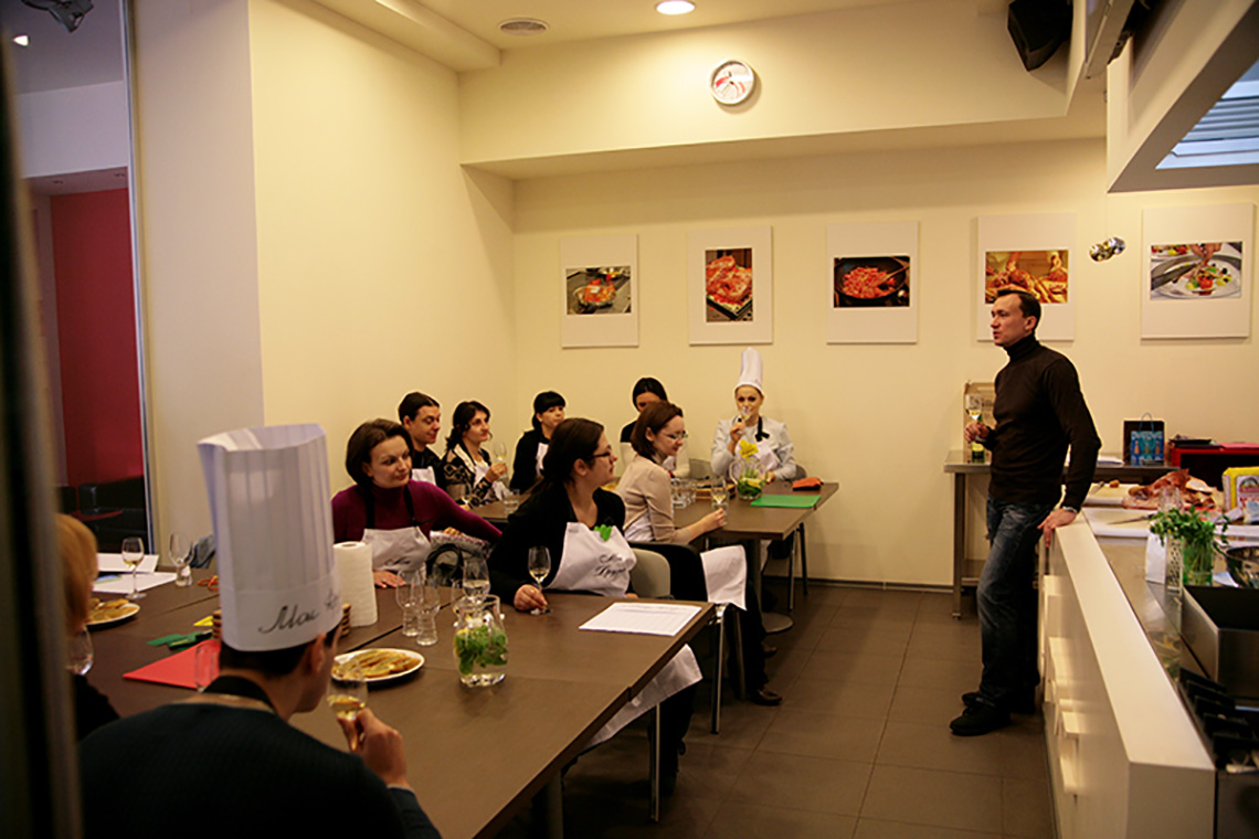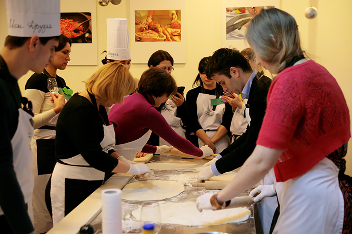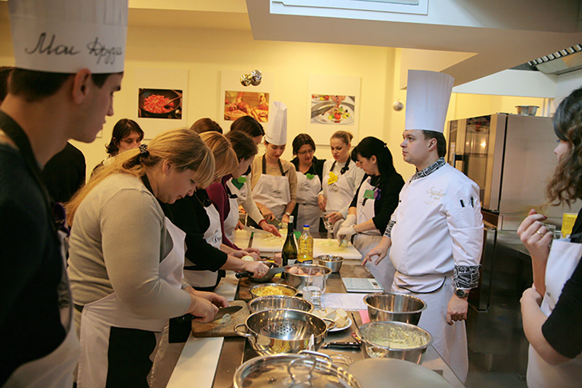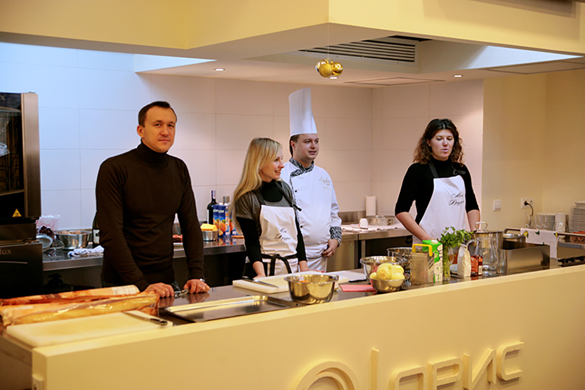 The festive New Year mood did not miss our school. We decided to end our culinary year with French cuisine lesson and devote it to the province of Alsace and the famous Strasbourg Christmas Market, the most beautiful and delicious fair in Europe. Especially for the lesson, as it is in our school tradition, we brought local delicacies, stories and, of course, recipes. Together with the chef of the French restaurant, Vadim Chevganiuk, we prepared dishes that one can taste at the Christmas market: toast with snail butter, gratin with spätzle and bacon, tart flambée, clafoutis cherry pie, mulled wine made from red wine and orange juice. Everything that can warm an enthusiastic tourist wandering through the narrow streets of Strasbourg. We not only tasted the traditional dishes of Alsace, but also immersed ourselves into the atmosphere of the French holidays, found out why a Christmas tree appears in our houses for Christmas, why a French Christmas cake looks like a log, why Christmas decorations have the shape of a ball… Sommelier Konstantin Vidoborenko suggested Alsatian wines Gewurztraminer Reserve Alsace 2012 Jean-Baptiste Adam and Pinot Gris Alsace 2011 Cave de Turckheim for the lesson. And we also had a special guest – the director of Alliance Française Odessa, Mr. Sylvain Bano. He told us stories about the traditions of his country. Like any Frenchman, Sylvan cooks well. We asked him to tell us his opinion on our culinary skills. The answer was short – some dishes tasted better than at home!!!